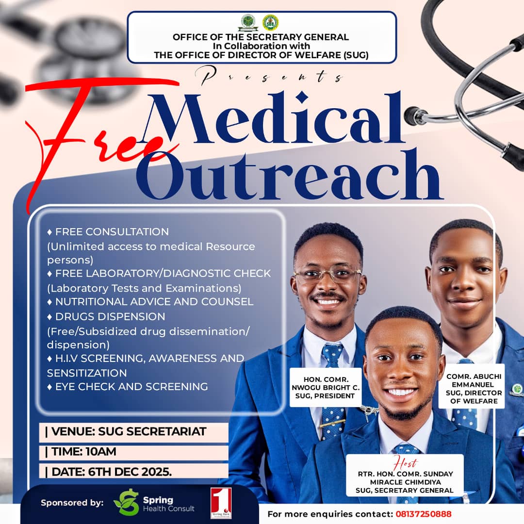 Get ready for something amazing! 🎉We’re excited to invite you to our Medical Outreach happening on December 6th, 2025 at SUG SECRETARIAT, right opposite the NDDC Hostel! It’s going to be a day filled with warmth, care, and positive vibes. Come for free health checks,...