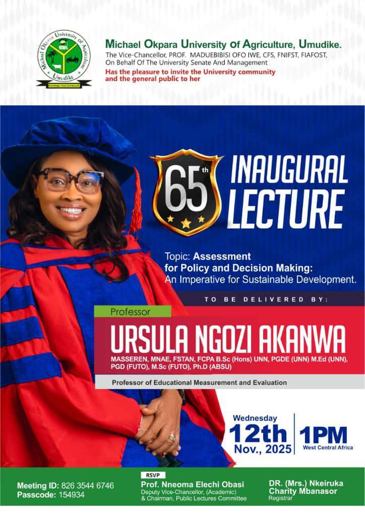 The entire Michael Okpara University of Agriculture, Umudike (MOUAU) community is celebrating a remarkable academic achievement as Prof. Ngozi Akanwa Ursula, the Deputy Vice-Chancellor (Administration), delivers the 65th Inaugural Lecture of the University.