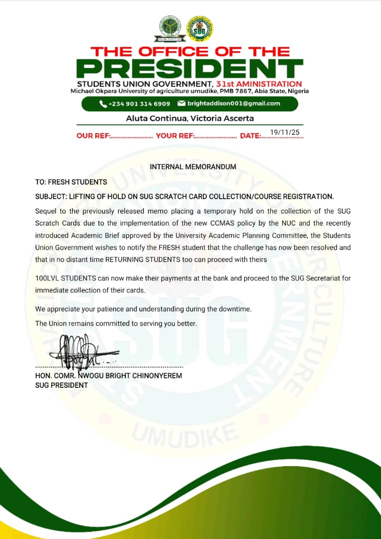 The SUG announces the lifting of hold on SUG Scratch card collection/course registration, sequel to the previously released memo placing a temporary hold on the collection of scratch cards due to the implementation of the new CCMAS policy by the NUC and the recently introduced Accademic Brief approved by the University Academic Planning Committee.